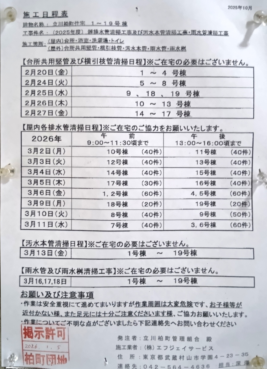 屋内排水管清掃日程2026.2月~3月